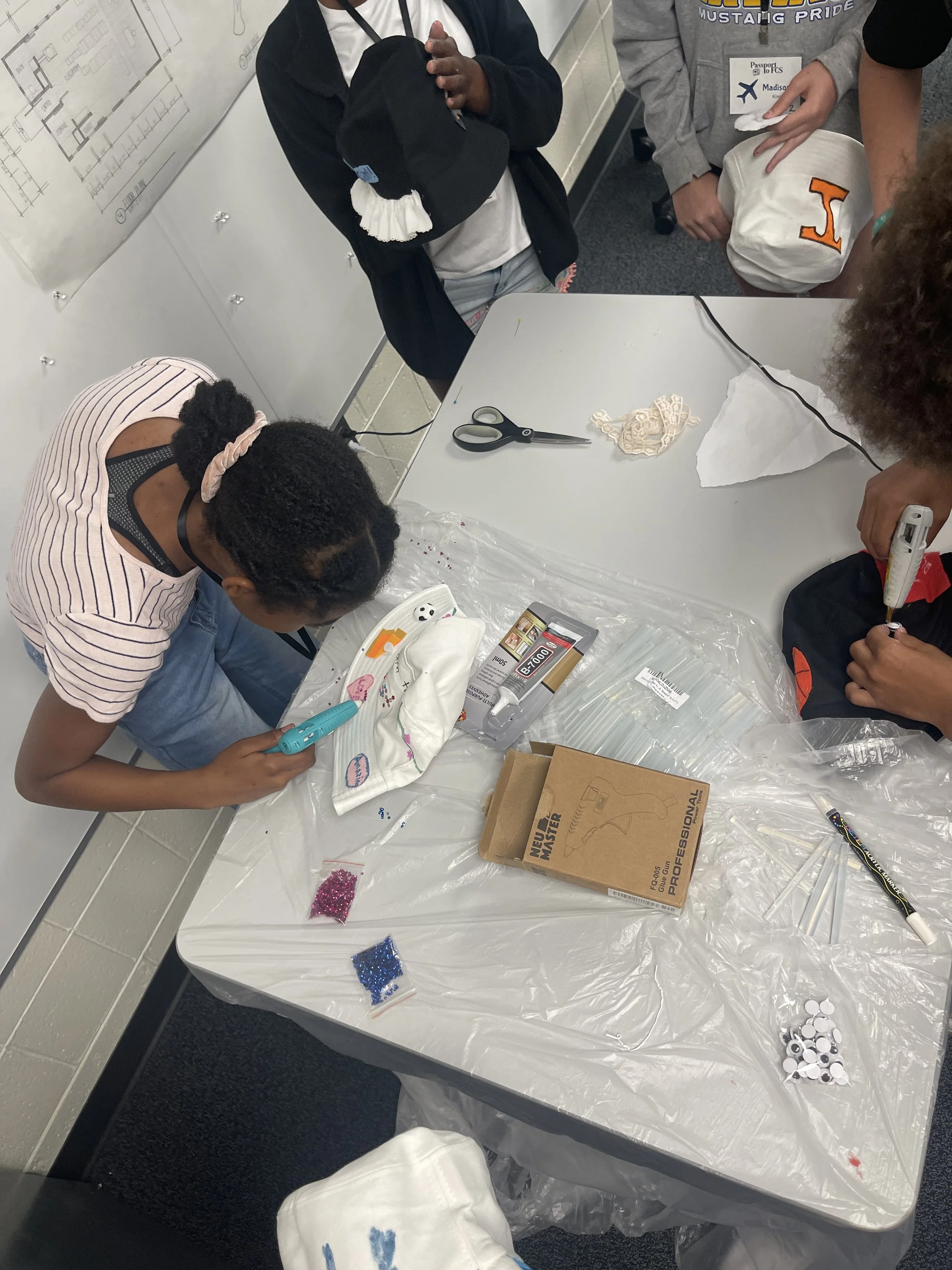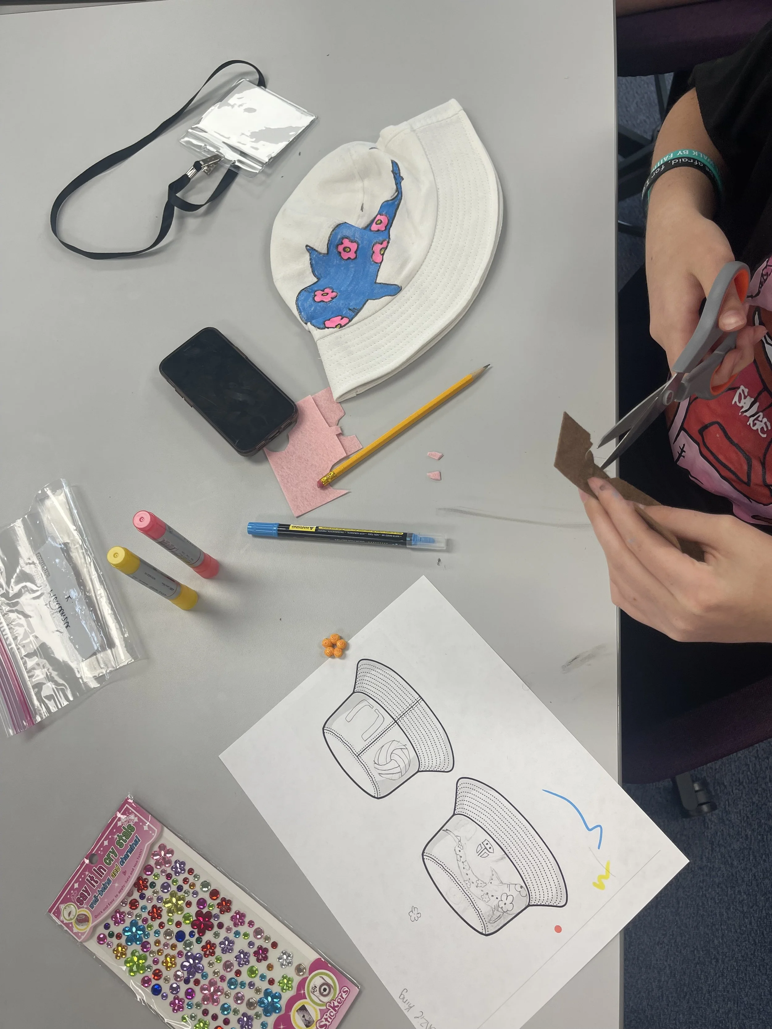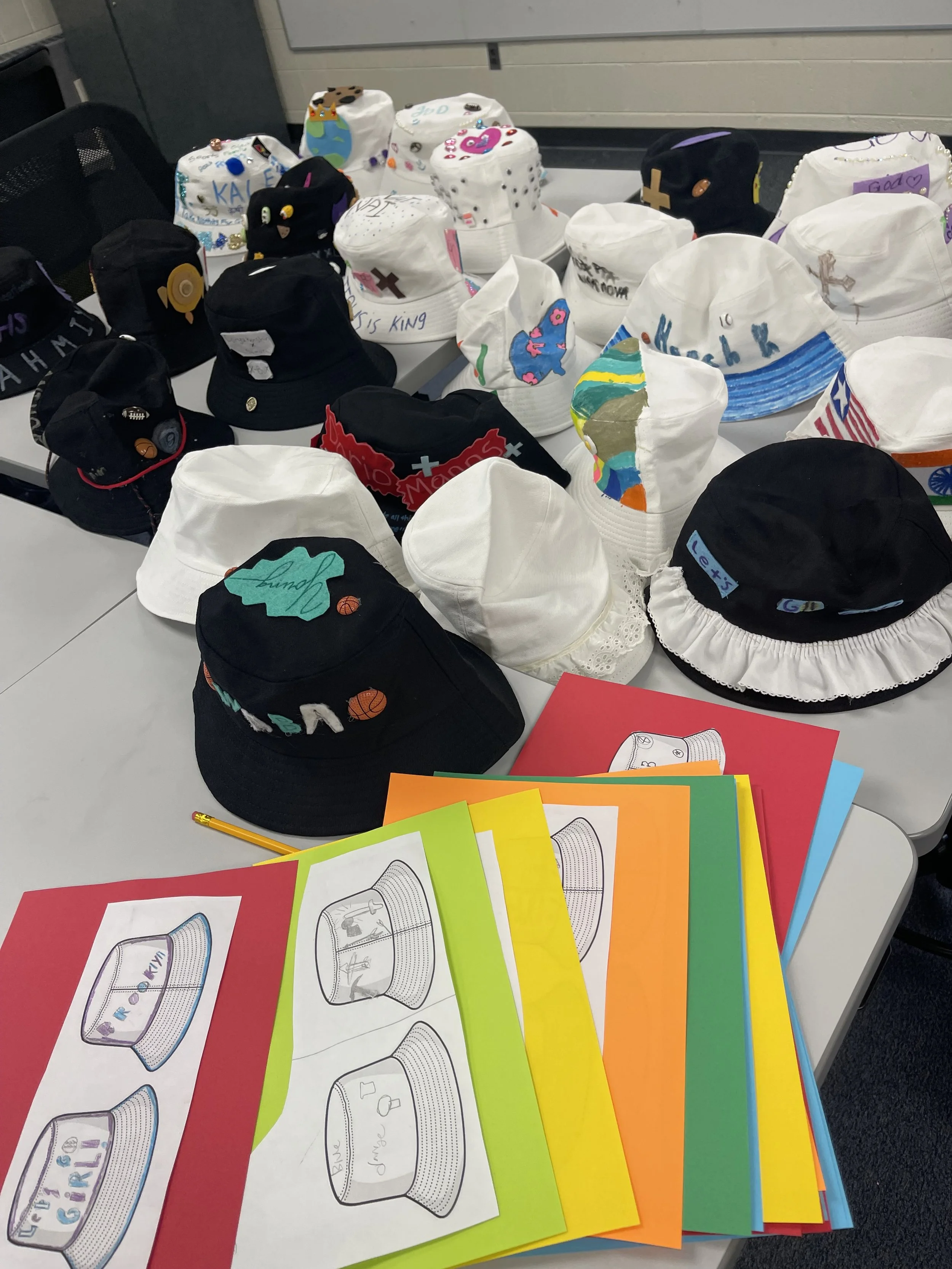 Students learned about the different types of Korean headwear and the symbolism behind each piece. They were then given time to sketch their design and finally create their own bucket hat, including imagery that symbolizes their identity.